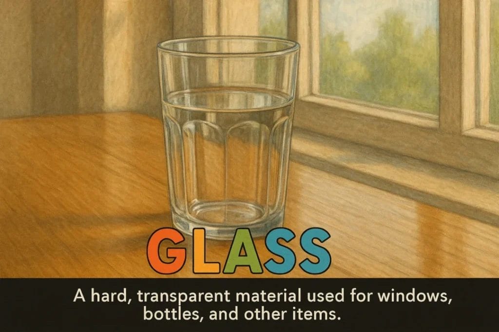 Glass Definition: A hard, transparent material used for windows, bottles, and other items.